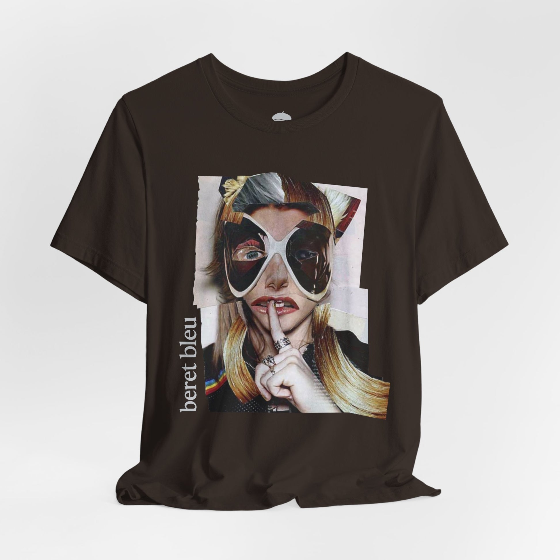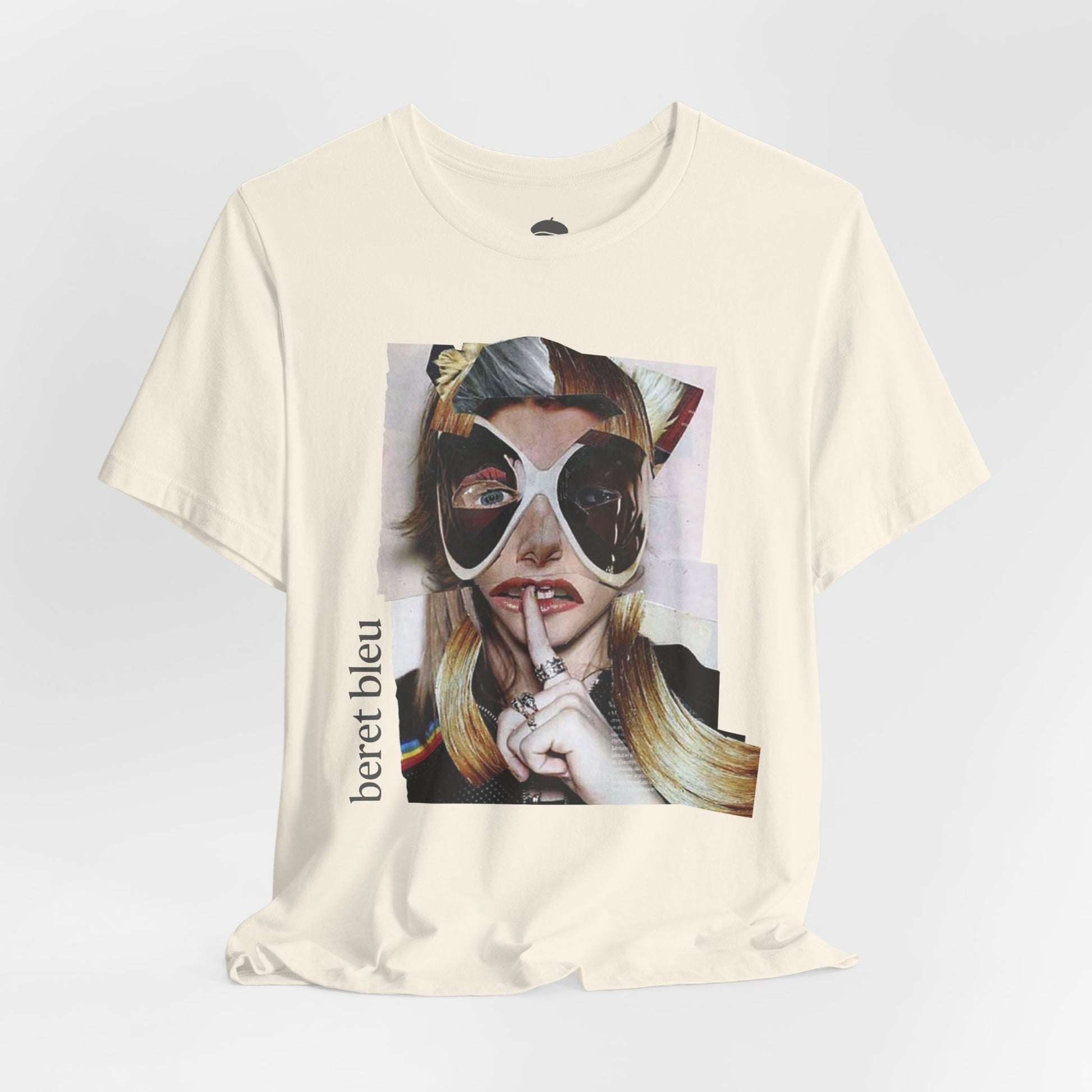 The collage features a woman holding a finger to her lips in a mischievous shhh, adding a dash of humor and attitude to your look. It's made for anyone who loves comfort with art, and style with a playful twist. It brings a little bold fun to every day.